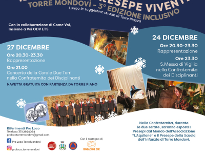 La sera del 24 e del 27 dicembre la Pro loco di Torre Mondovì riproporrà, lungo le suggestive vie del rione Piazza, la 14ª edizione del Presepe vivente.