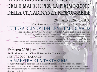 Venerdì 20 marzo, alle ore 9,00 presso l'Auditorium Civico di Borgo San Dalmazzo, siete tutti invitati a presenziare in occasione della quarta Giornata della memoria e dell’impegno in ricordo delle vittime innocenti delle mafie.