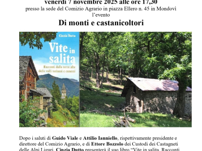 Il Comizio Agrario e i Custodi dei Castagneti delle Alpi Liguri organizzano venerdì 7 novembre 2025 alle ore 17,30 presso la sede del Comizio Agrario in piazza Ellero n. 45 in Mondovì l’evento "Di monti e castanicoltori". L’evento è gratuito.
