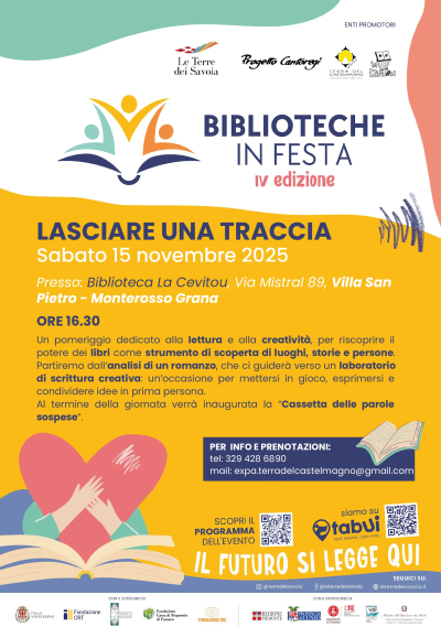 Sabato 15 novembre, alle ore 16.30, presso la Biblioteca “La Cevitou” (Via Mistral 89, Villa San Pietro – Monterosso Grana), si terrà un incontro dal titolo “Lasciare una traccia”, un momento di condivisione aperto a tutti.