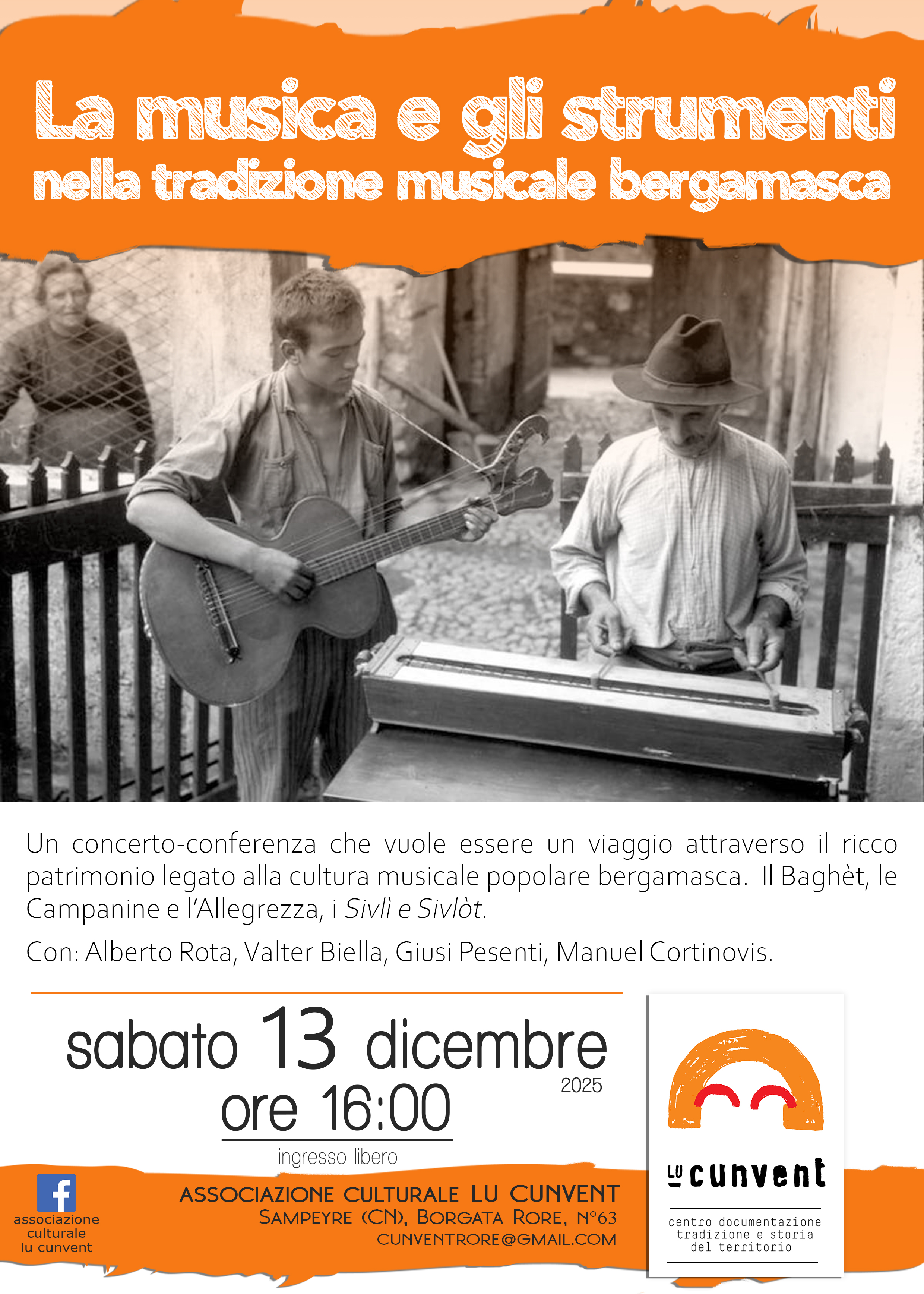 Nel pomeriggio di sabato 13 dicembre alle ore ore 16.00, concerto-conferenza che vuole essere un viaggio attraverso il ricco patrimonio legato alla cultura musicale popolare bergamasca a Lu CUNVENT, centro documentazione tradizione e storia del territorio di Borgata Rore a Sampeyre.