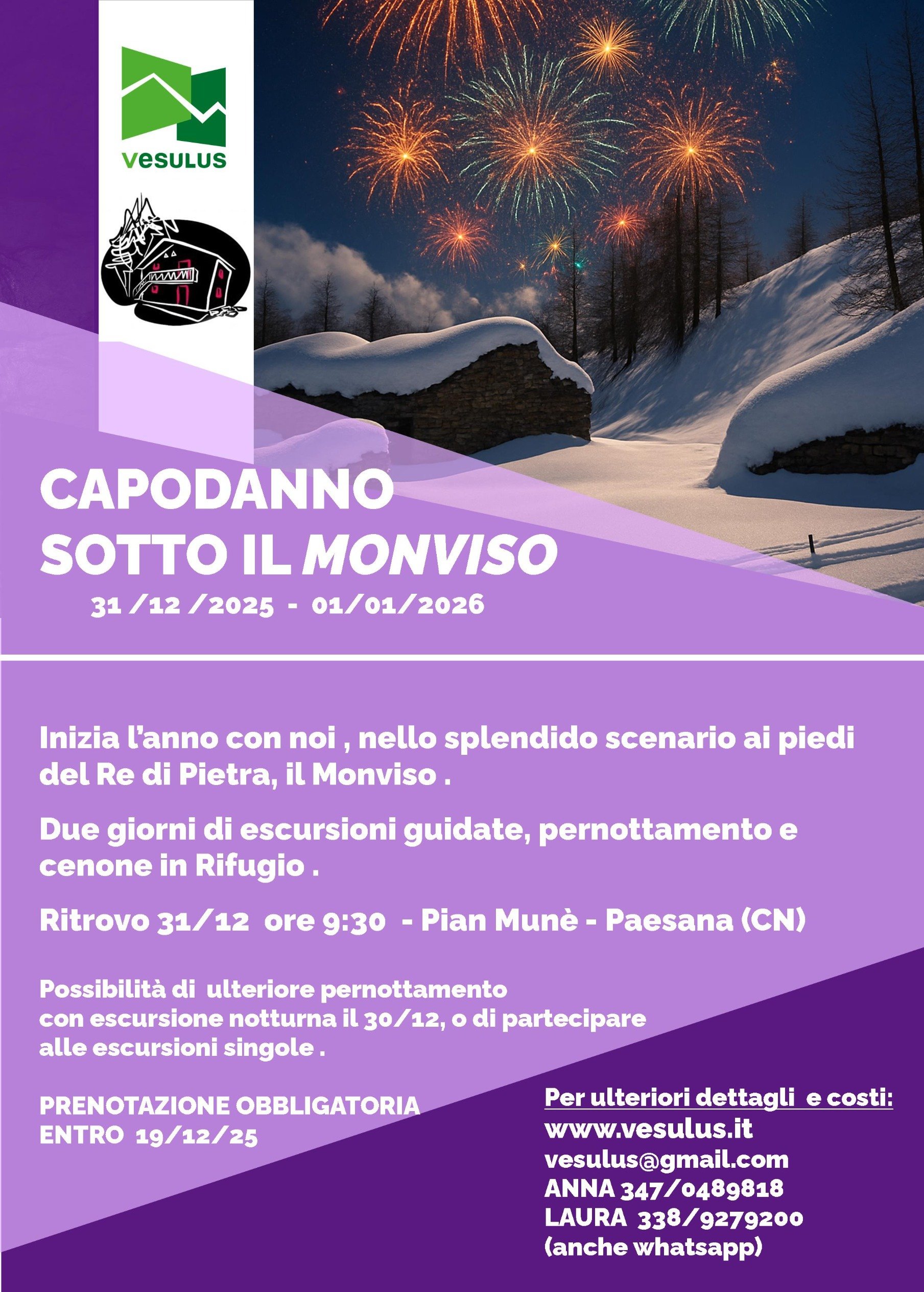 Inizia l’anno nello splendido scenario ai piedi del Re di Pietra con una due giorni di escursioni con pernottamento e cenone presso il Rifugio Bertorello a 1375 m di quota. Il ritrovo è previsto il 31 dicembre a Pian Munè (Paesana) con possibilità di pernottare in rifugio mentre il 1° gennaio 2026 ci si sposterà, con le auto, verso il Pian della Regina (Crissolo). Attività adatta a tutti, purchè abituati a fare attività fisica. Prenotazione obbligatoria.