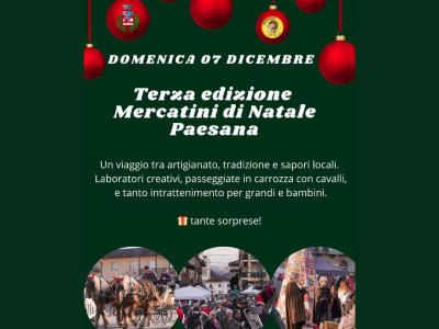 Il 7 Dicembre 2025 si terrà la Terza edizione dei Mercatini di Natale di Paesana esplorando la tradizione, i sapori locali, l'artigianato, passeggiate in carrozza e cavalli, laboratori creativi e intrattenimento per tutte le età.