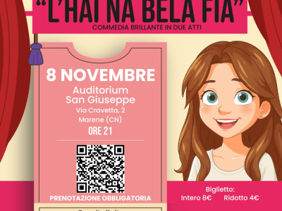 Sabato 8 novembre alle ore 21.00, presso l'Auditorium San Giuseppe di Marene, la Compania Teatral Moreteisa La Menodrammatica porterà in scena la commedia brillante in due atti “’L’hai na bela fia”. Biglietto intero 8€, ridotto 4€.