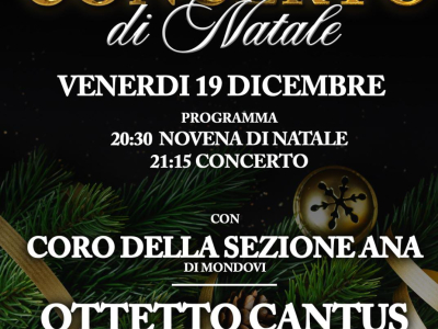 Venerdì 19 dicembre la chiesa di San Filippo di Mondovì propone, alle ore 21.15 (dopo la novena delle ore 20.30) un concerto del coro della sezione ANA di Mondovì "Ottetto Cantus Firmus". Ingresso gratuito