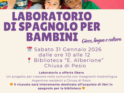 La Biblioteca Civica “Ezio Alberione” di Chiusa di Pesio ospiterà sabato 31 gennaio, dalle 10 alle 12, il "Laboratorio di Spagnolo per Bambini", un’iniziativa dedicata ai più piccoli all’insegna del gioco, della lingua e della scoperta della cult