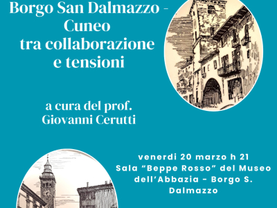 La sera di venerdì 20 marzo alle h 21, nella Sala “Beppe Rosso” del Museo dell’Abbazia di Borgo San Dalmazzo, l'associazione Pedo Dalmatia propone: “Borgo San Dalmazzo-Cuneo, tra collaborazione e tensioni”.