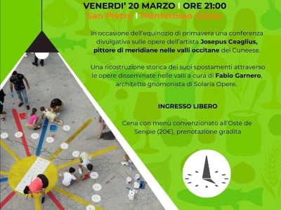 Venerdì 20 marzo, ore 21.00, l’Ecomuseo Terra del Castelmagno propone una conferenza divulgativa sulle opere dell’artista Josepus Ceaglius, pittore di meridiane attivo tra il 1678 e il 1727 nelle valli occitane del Cuneese, guidata da Fabio Garnero, architetto gnomonista di Solar