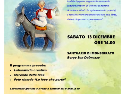 Sabato 13 dicembre, a partire dalle ore 14,00 presso il Santuario di Monserrato di Borgo San Dalmazzo, in occasione della "Festa di Santa Lucia" i volontari del santuario organizzeranno un laboratorio creativo pensato per bambini dai 6 anni in su