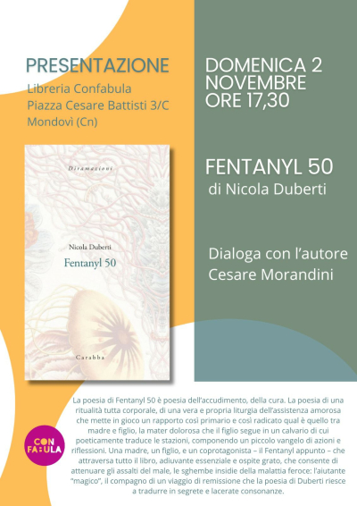 Domenica 2 novembre alle ore 17.30, la libreria Confabula di Piazza Cesare Battisti a Mondovì ospita la presentazione del libro "Fentanyl 50" di Nicola Duberti. Dialoga con l'autore Cesare Morandini. Ingresso libero
