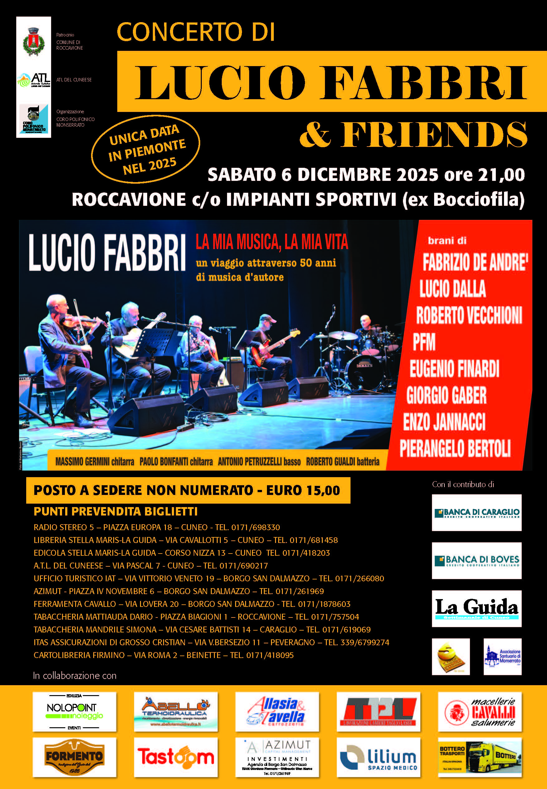 Sabato 6 dicembre alle ore 21,00 a Roccavione presso gli impianti sportivi (ex Bocciofila) si tiene il concerto (unica data in Piemonte 2025) di Lucio Fabbri & Friends, un viaggio attraverso 50 anni di musica d'autore.