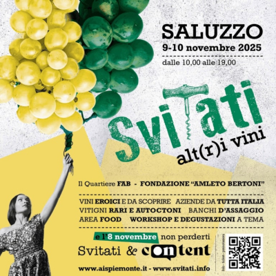 Il 9 e 10 novembre, presso la Fondazione Amleto Bertoni di Saluzzo, dalle 10.00 alle 19.00 va in scena la rassegna “Svitati” dedicata ai vini da piccole produzioni, da vitigni rari e antichi, coltivati in zone marginali e spesso estreme, con banchi di assaggio di piccoli produttori “eroici” provenienti da tutta Italia. Quest’anno Svitati si arricchisce di un evento collaterale, previsto per l’8 novembre: Svitati & Content, una giornata ricca di incontri e di talk. Ulteriori dettagli disponibili qui.