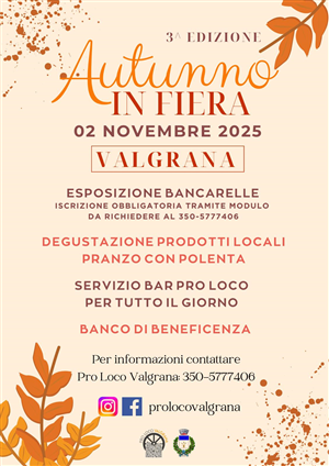 Visto il successo delle precedenti edizioni, a Valgrana ritorna anche quest'anno "Autunno in Fiera", organizzata dalla locale Pro Loco e prevista per domenica 2 novembre. Durante la giornata: esposizione di bancarelle, degustazione di prodotti tipici locali e pranzo con polenta per tutti. Sarà allestito un banco di beneficenza e per tutto il giorno il servizio Bar della Pro Loco.