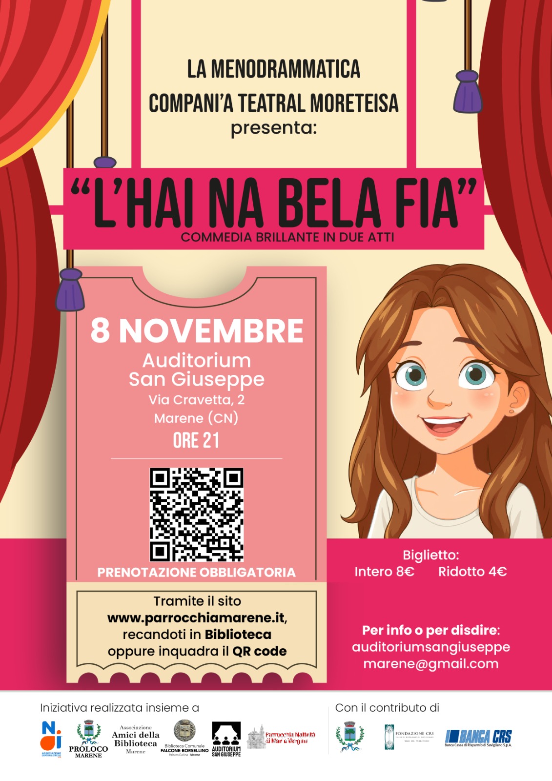 Sabato 8 novembre alle ore 21.00, presso l'Auditorium San Giuseppe di Marene, la Compania Teatral Moreteisa La Menodrammatica porterà in scena la commedia brillante in due atti “’L’hai na bela fia”. Biglietto intero 8€, ridotto 4€.