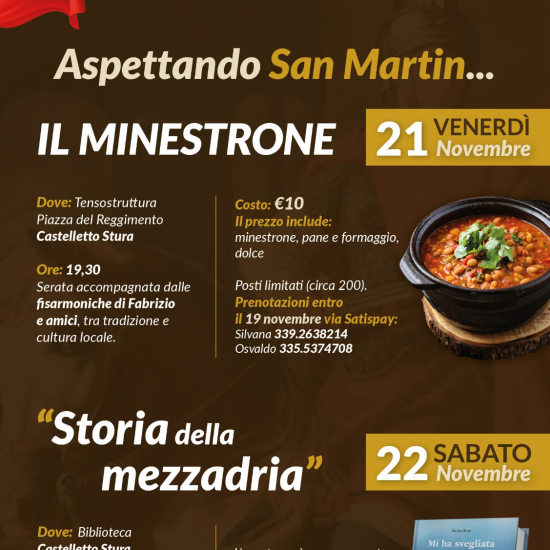 Domenica 23 novembre ritorna "El Festin ed San Martin": rievocazione storica con animali e figuranti che animerà le vie di Castelletto Stura con la rappresentazione di "San Martino e il povero" e del "Tramud ed San Martin". Durante la giornata mercatino agricolo ed esposizione di abiti da sposa vintage. La festa sarà anticipata venerdì 21 novembre dalla serata gastronomica dedicata al minestrone e sabato 22 novembre dall'incontro presso la biblioteca "Storia della Mezzadria" e presentazione del romanzo "Mi ha svegliato il silenzio".