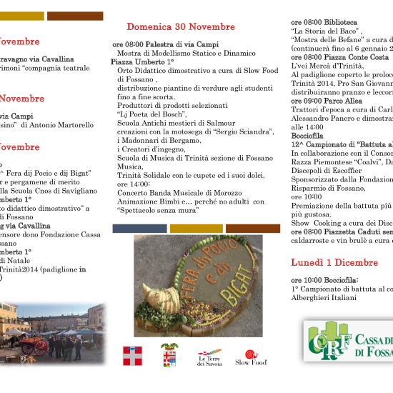 Da sabato 22 a domenica 30 novembre Trinità ospita la "21^ Fera dij Pocio e dij Bigat": tradizionale appuntamento fieristico dedicato alle nespole e ai bachi da seta con tantissimi momenti di divertimento, eventi culturali, orti didattici, appuntamenti enogastronomici ed il 12^ Campionato di "Battuta al Coltello".