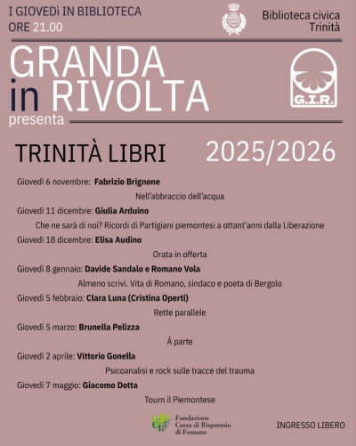 La rassegna Granda in Rivolta approda con la poesia e la prosa a Trinità e propone un calendario di otto appuntamenti culturali con scrittori, poeti e studiosi del territorio: gli incontri si terranno alle ore 21 nella Biblioteca comunale, da novembre a maggio, con ospiti di rilievo come Fabrizio Brignone, Giulia Arduino, Elisa Audino, Davide Sandalo e Romano Vola, Clara Luna, Brunella Pelizza, Vittorio Gonella e Giacomo Dotta. Ingresso libero.