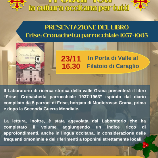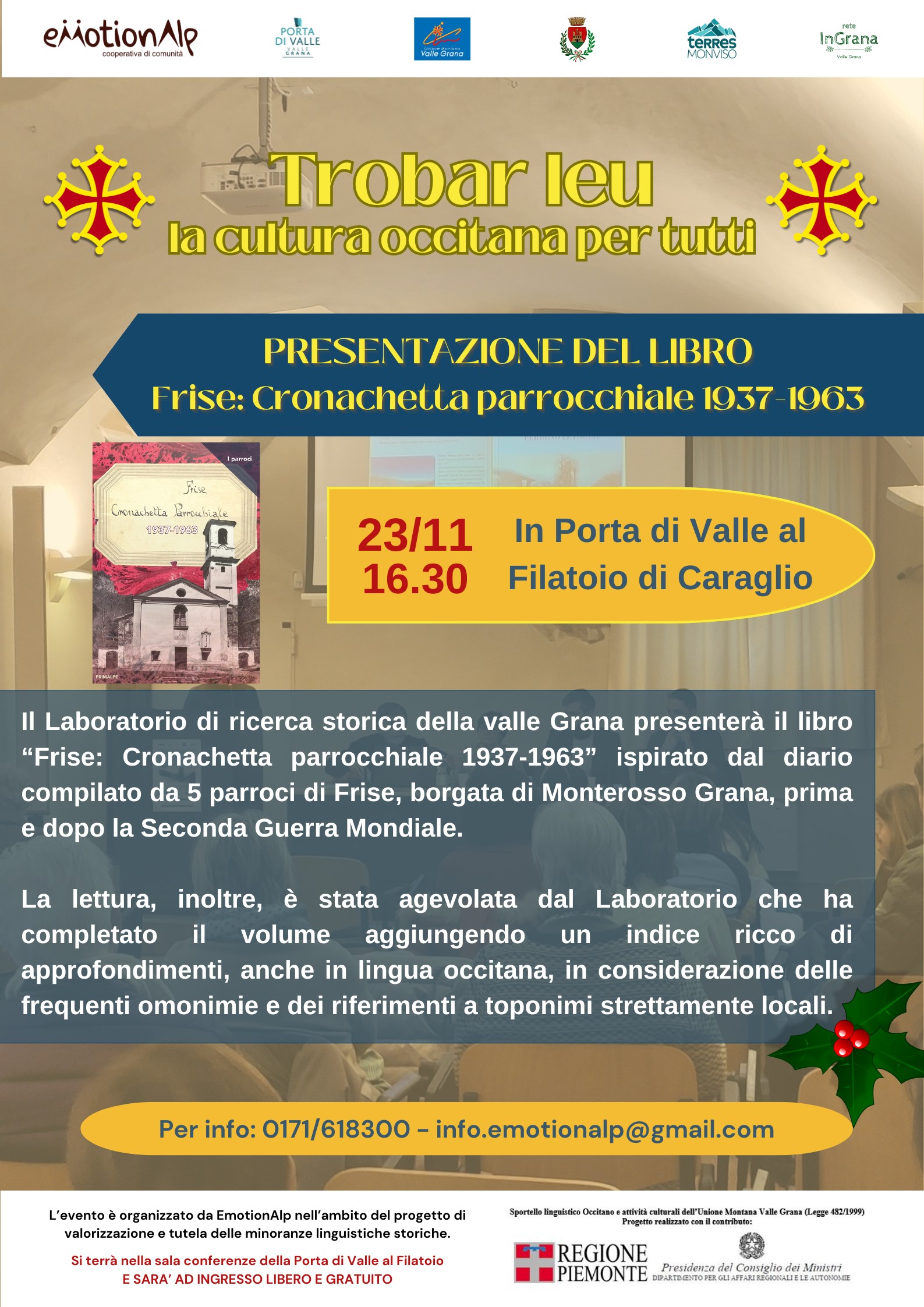 Ritorna la rassegna “Trobar Leu – La Cultura Occitana per tutti” organizzata dalla Cooperativa EmotionAlp in Porta di Valle della Valle Grana. Gli appuntamenti della rassegna saranno distribuiti tra novembre (dal 15) e dicembre, cinque in totale, tra lezioni, concerto, presentazioni, proiezioni e laboratori.