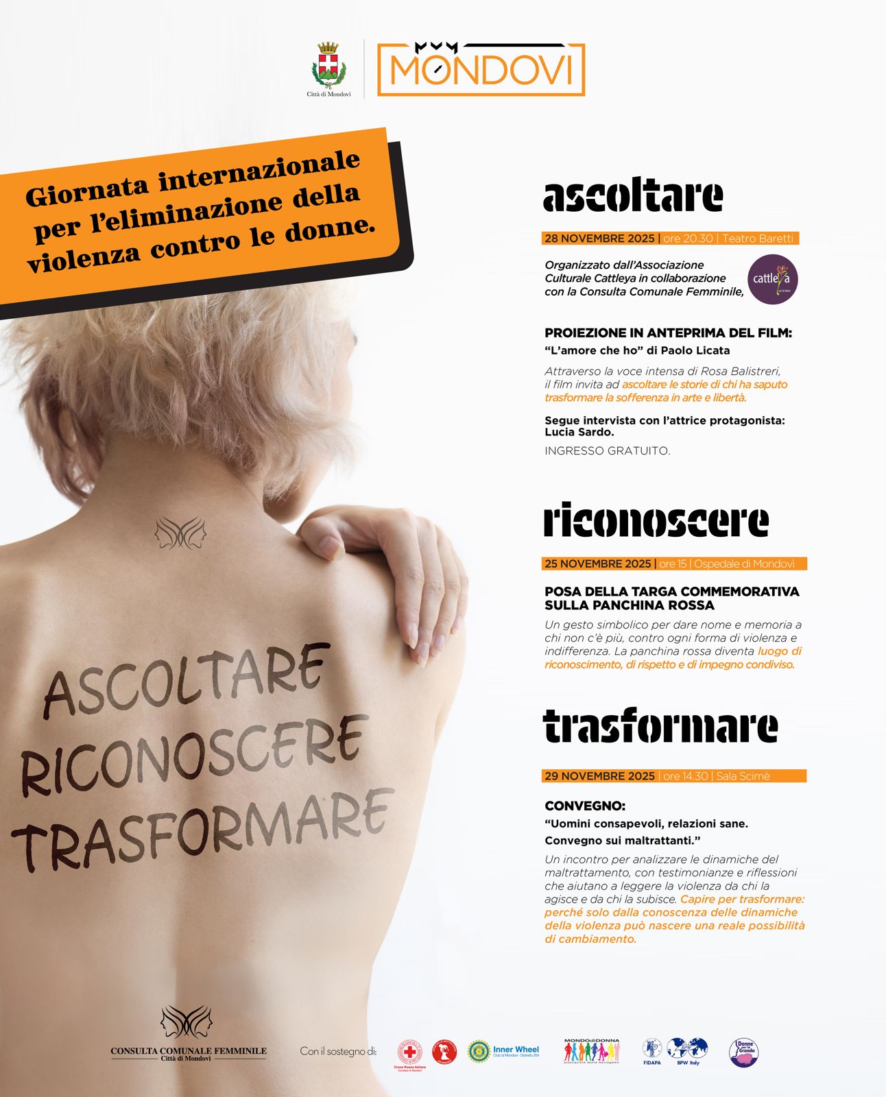 Nell'ambito della Giornata Internazionale per l'eliminazione della violenza contro le donne, il Comune di Mondovì e la Consulta Comunale Femminile con Associazione Culturale Cattleya propongono tre momenti aperti alla cittadinanza per riflettere e agire contro la violenza di genere. Un percorso in tre verbi — ascoltare, riconoscere, trasformare — per costruire consapevolezza e comunità.
