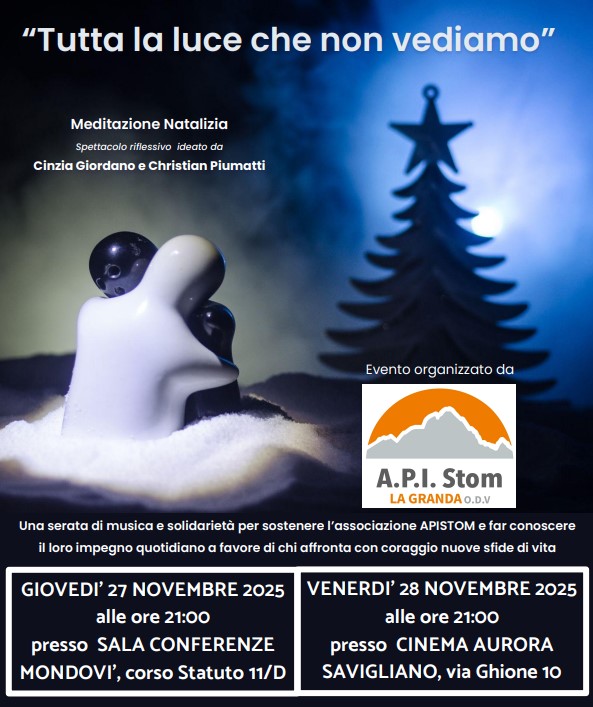 Due serate a Mondovì e Savigliano per riscoprire i veri valori del Natale attraverso lo spettacolo "Tutta la luce che non vediamo" e conoscere l'associazione Apistom (associazione di volontariato della provincia di Cuneo rivolta a persone portatrici di stomia e incontinenti). La serata è ad ingresso libero e gratuito. Appuntamento giovedì 27 novembre alle ore 21 presso la sala Scimè di Mondovì, venerdì 28 novembre alle ore 21 al cinema Aurora di Savigliano.