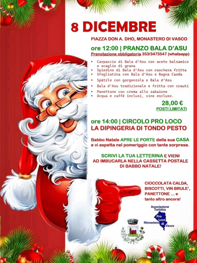 L’8 dicembre Monastero di Vasco celebra il Natale con una giornata intera dedicata al buon cibo e alla magia per i bambini. In programma un pranzo con la specialità "bala d'asu" come protagonista e sorprese per i più piccoli.