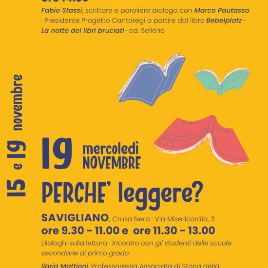 Ritorna "Biblioteche in festa", l’innovativo format culturale ideato e promosso da Associazione Le Terre dei Savoia e da Progetto Cantoregi, pensato per rimettere al centro i libri, i luoghi che li ospitano e le persone che se ne prendono cura, per un’edizione 2025 rivolta soprattutto ai ragazzi e giovani adulti. A Savigliano sono in programma appuntamenti previsti il 19, 28 e 29 novembre. Ingresso libero.