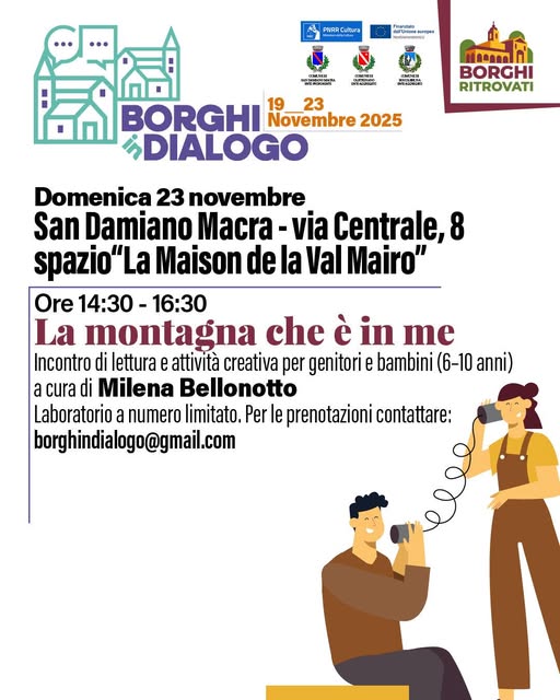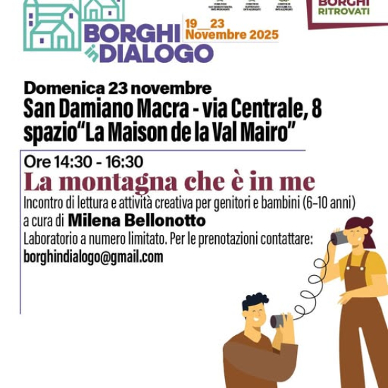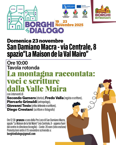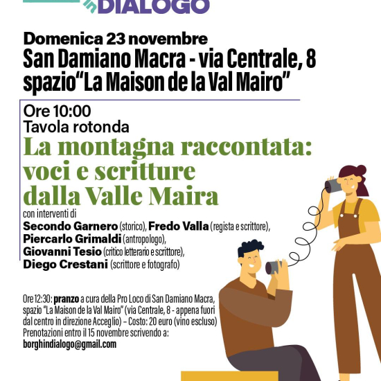La montagna raccontata: voci e scritture dalla valle Maira. È questo il titolo della tavola rotonda di domenica 23 novembre, alle 10, presso gli spazi de La Maison de la Val Mairo a San Damiano Macra. L’iniziativa vedrà confrontarsi lo storico Secondo Garnero, il regista e scrittore Fredo Valla, l’antropologo Piercarlo Grimaldi, il critico letterario e scrittore Giovanni Tesio e lo scrittore e fotografo Diego Crestani Seguirà, alle 12.30, un pranzo (su prenotazione) a cura della Pro Loco di San Damiano. Prenotazione obbligatoria.