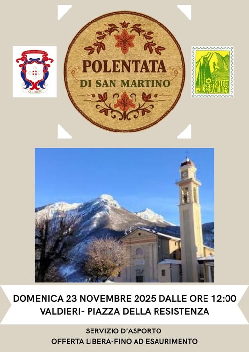 Domenica 23 novembre, a Valdieri in piazza della Resistenza, è organizzata una polentata in occasione di San Martino. Servizio d'asporto con offerta libera fino a esaurimento scorte a partire dalle ore 12. Prenotazione non necessaria.