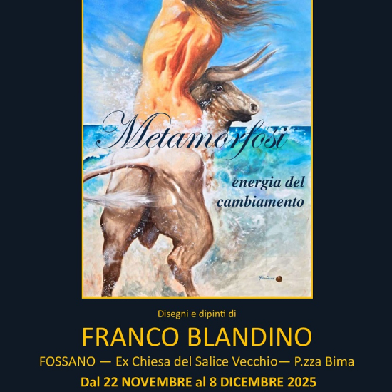 Da sabato 22 novembre a lunedì 8 dicembre la suggestiva ex chiesa del Salice Vecchio a Fossano ospita la mostra del pittore Franco Blandino: "Le Metamorfosi nell'arte - L'energia del cambiamento, da Ovidio al Vangelo di Luca". Orario: venerdì e sabato dalle 15.30 alle 19.30; domenica e l’8 dicembre dalle 10 alle 12 e dalle 15.30 alle 19.30, ingresso libero.