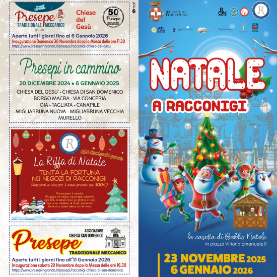 Dal 23 novembre al 4 gennaio Racconigi festeggia il periodo natalizio con tantissimi eventi dedicati, musica, mercatini, visite guidate, enogastronomia e tanto divertimento per grandi e piccini. Scopri il programma completo nella locandina in basso.