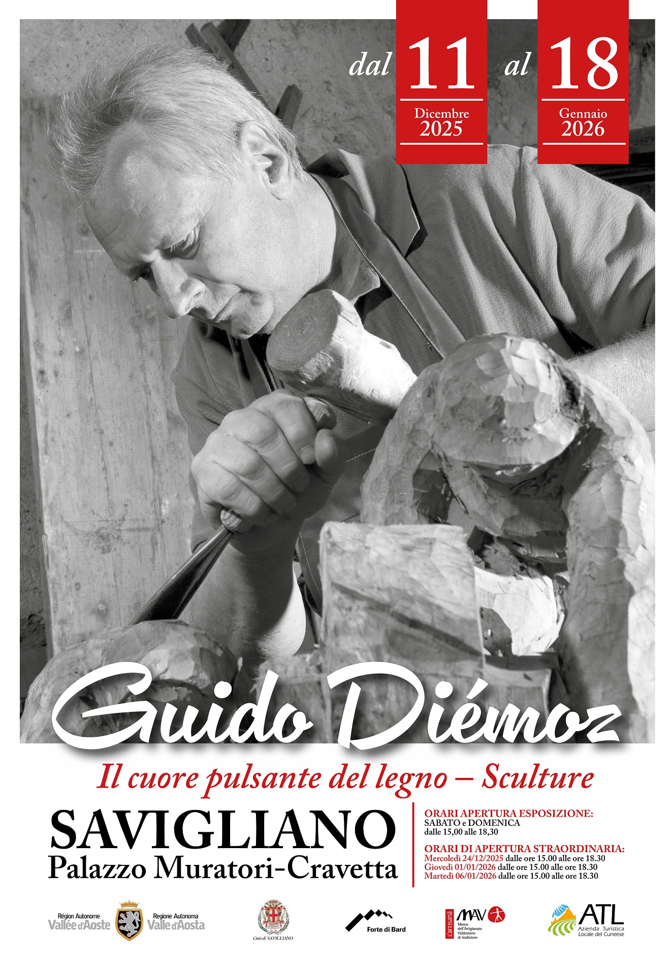 Dal 11 dicembre al 18 gennaio, presso Palazzo Muratori Cravetta a Savigliano, "Il cuore pulstante del legno - Sculture" mostra di Guido Dièmoz. Orario sabato e domenica dalle ore 15.00 alle 18.30. Aperture straordinarie il 24 dicembre, 1 e 6 gennaio.