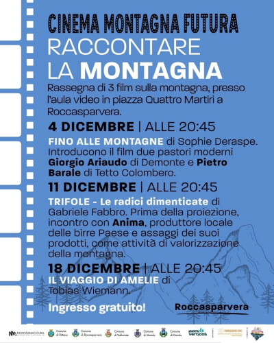Giovedì 4, 11 e 18 dicembre, presso l'aula video in piazza Quattro Martiri, a Roccasparvera, si terrà la rassegna "Raccontare la montagna". Tre serate dedicate alla montagna e alle sue storie: vite reali, luoghi che resistono, comunità che cambiano.