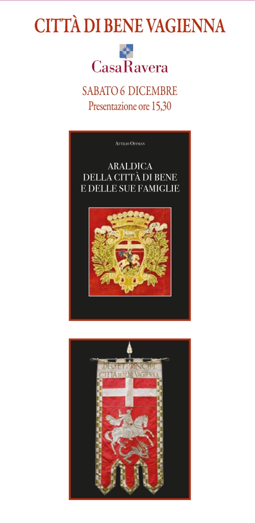 Sabato 6 dicembre alle 15.30 presso Casa Ravera a Bene Vagienna, presentazione di "Araldica della città di Bene e delle sue Famiglie", volume che illustra gli stemmi della Comunità benese e delle Famiglie nobili e notabili che ne fecero parte, a cura di Attilio Oman. Ingresso libero.
