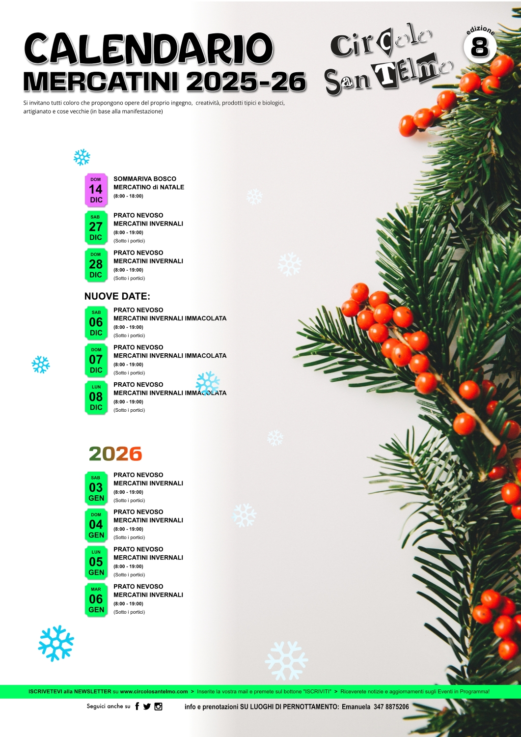 I mercatini invernali del Circolo San Telmo vi aspettano sotto i portici di Prato Nevoso (Frabosa Sottana), in più date dal 6 dicembre al 6 gennaio 2026, con prodotti tipici selezionati, opere creative e di artigianato. Programma disponibile di seguito e sul sito ufficiale.