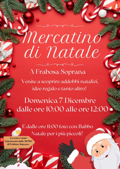 Domenica 7 dicembre dalle 10.00 alle 12.00 a Frabosa Soprana vi aspetta un mercatino di Natale in piazza Municipio, per scoprire addobbi natalizi, idee regalo e tanto altro. Dalle 11.00 foto con Babbo Natale per i più piccoli.
