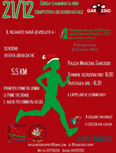 Il 21 dicembre Garessio si riempie di rosso con la corsa–camminata dei Babbi Natale, una non competitiva aperta a tutti. Un percorso di 5,5 km con iscrizione a offerta libera: il ricavato sarà devoluto alla Fondazione per la Ricerca sulla Fibrosi Cistica.