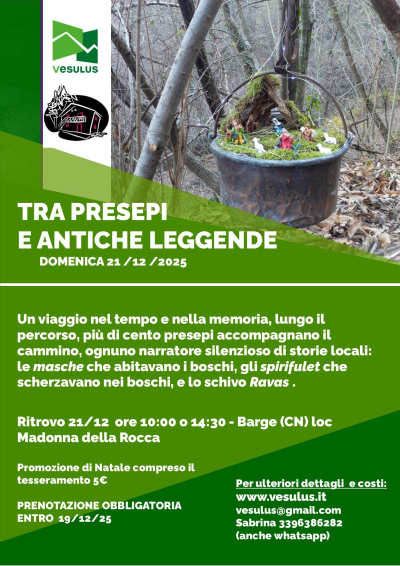 Il 21 dicembre, a Barge, è organizzata una facile escursione guidata che diventa un viaggio nel tempo e nella memoria. Lungo il percorso, più di cento presepi accompagnano il cammino, ognuno narratore silenzioso di storie locali: le masche che abitavano i boschi, gli spirifulet che scherzavano nei boschi, e lo schivo Ravas e la vita semplice di un tempo ormai lontano. Due partenze previste (10 e 14.30) a prenotazione obbligatoria.