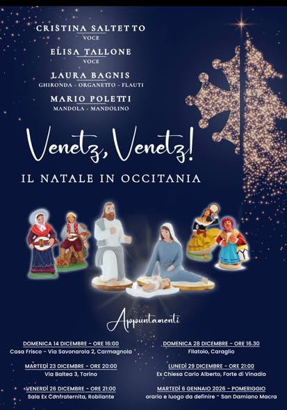 Il 28 dicembre, alle ore 16.30 al Filatoio di Caraglio, ci sarà un concerto di Natale. 2 voci accompagnate dal suono della ghironda, dell'organetto, del flauto, delle mandole e del mandolino per riprendere le tipiche musiche della tradizione occitana. Ingresso libero.