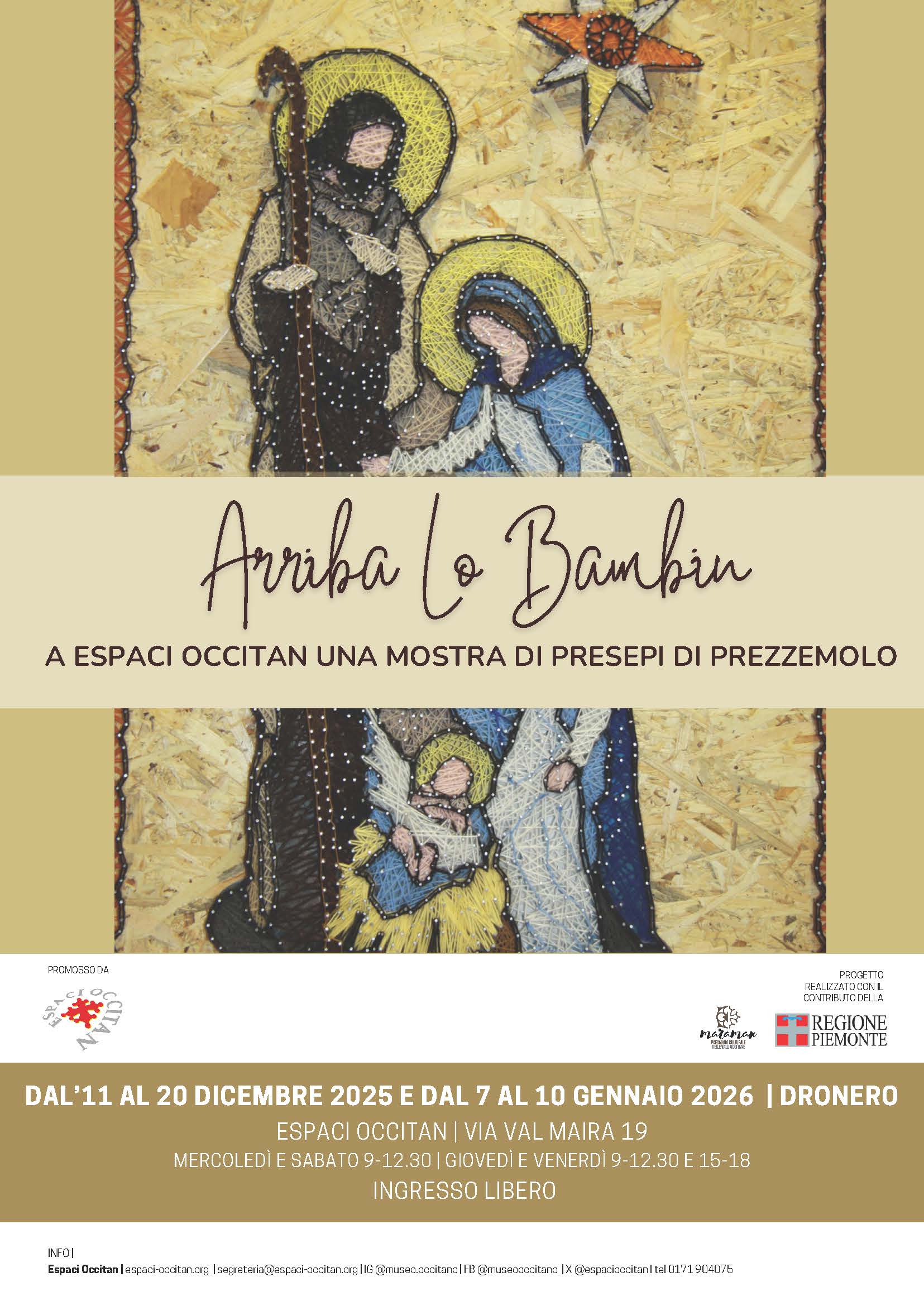 Piccola mostra di presepi realizzati da Mario Collino in arte Prezzemolo ospitata dal’11 al 20 dicembre e dal 7 al 10 gennaio in Espaci Occitan. La mostra sarà visitabile gratuitamente e senza necessità di prenotazione negli orari di apertura del centro: mercoledì e sabato 9-12.30, giovedì e venerdì 9-12.30 e 15-18.