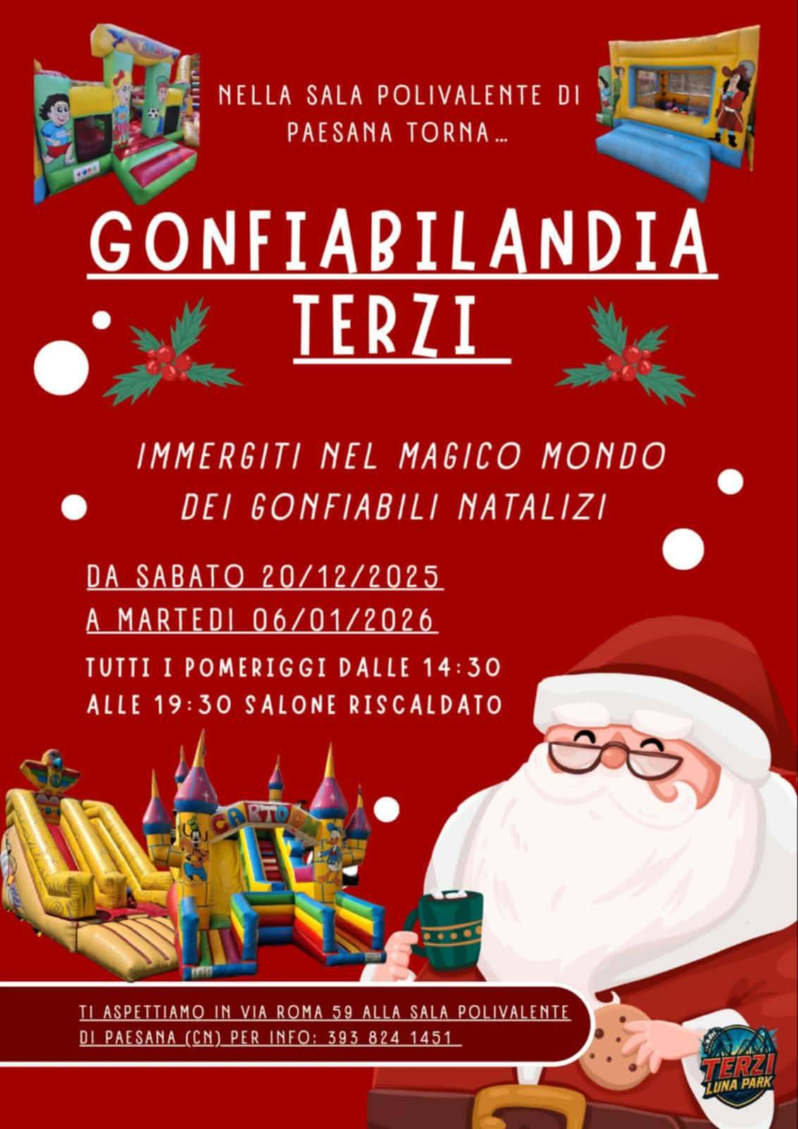 Da sabato 20 dicembre a martedì 6 gennaio, nella sala polivalente di Paesana sarà presente Gonfiabilandia, un mondo magico di gonfiabili natalizi in cui i bambini potranno immergersi e divertirsi. Aperto tutti i pomeriggi dalle ore 14.30 alle ore 19.30.