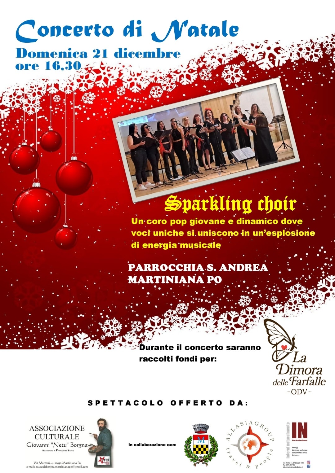 Domenica 21 dicembre alle ore 16.30, nella suggestiva cornice della Chiesa Parrocchiale di Sant’Andrea di Martiniana Po, le voci dello Sparkling Choir regaleranno al pubblico un emozionante Concerto di Natale organizzato dall'Associazione Culturale Giovanni Netu Borgna. Un pomeriggio di musica, armonie e atmosfera natalizia da vivere insieme. Durante il concerto saranno raccolti fondi per "La dimora delle farfalle ODV".