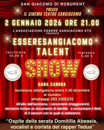 Ti piace cantare e vorresti esibirti in pubblico? Partecipa alla gara canora "Esseresangiacomo talent show" organizzata dall'associazione Essere Sangiacomo ETS il 2 gennaio alle ore 21:00 presso il Cinema centro congressi. Sarà presente alla gara Domitilla Abeasis, vocalist e corista del rapper Tedua.