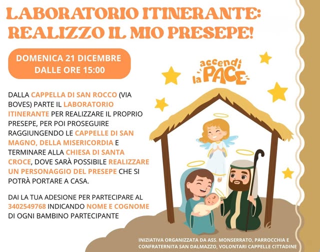 Laboratorio itinerante per grandi e piccoli a Borgo San Dalmazzo domenica 21 dicembre dalle ore 15.00. Partecipando al laboratorio itinerante, visiteremo insieme le chiese di San Magno, della Misericordia e Santa Croce, dove ogni bambino potrà realizzare un personaggio del presepe da portare a casa.