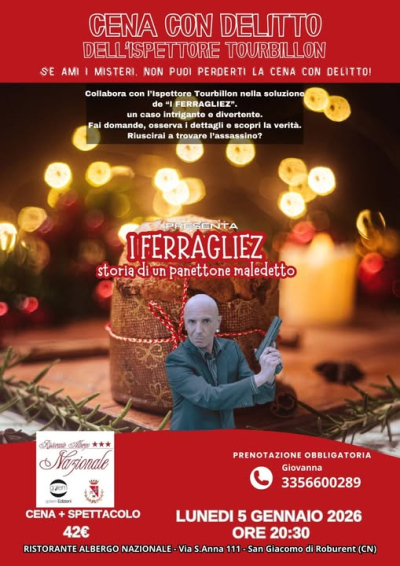 Lunedì 5 gennaio alle ore 20:30, presso il Ristorante Albergo Nazionale, la Pro Loco San Giacomo organizza una "Cena con delitto dell'ispettore Tourbillon". Aiutate l'ispettore a risolvere il caso "I Ferragliez - Storia di un panettone maledetto". La prenotazione per telefono è obbligatoria.