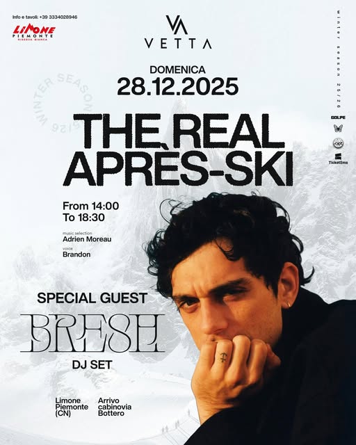 Domenica 28 dicembre il Vetta Club a Limone Piemonte, in cima alla Telecabina Bottero arriva Bresh. Appuntamento dalle 14 alle 18.30, ingresso libero.