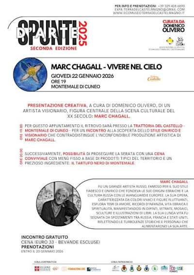 Giovedì 22 gennaio, alle ore 19.00, presso la Trattoria del Castello a Montemale di Cuneo, nuovo appuntamento della Rassegna "Spunti d'arte" organizzata dall'Ecomuseo Terra del Castelmagno con "Marc Chagall - Vivere nel cielo". Ingresso gratuito, prenotazioni entro il 20 gennaio.