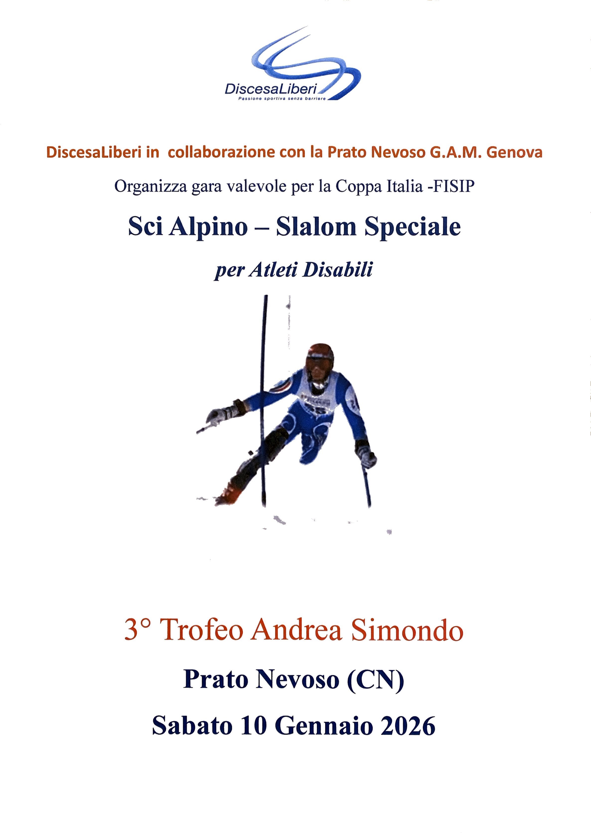 Discesaliberi in collaborazione con la Prato Nevoso G.A.M. Genova organizza la gara valevole per la Coppa Italia -FISIP Sci Alpino - Slalom Speciale per Atleti Disabili a Prato Nevoso (Frabosa Sottana) sabato 10 Gennaio 2026, 3° Trofeo Andrea Simondo.