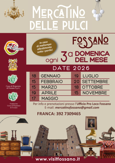 Domenica 17 maggio si tiene il Mercatino dell'Antiquariato e del Collezionismo in Via Roma a Fossano, dal mattino. In caso di maltempo, le bancarelle saranno allestite sotto i portici. Sulle bancarelle sarà possibile trovare oggetti, libri, stampe, quadri e cornici, prodotti tessili, monete, francobolli e mobili antichi.