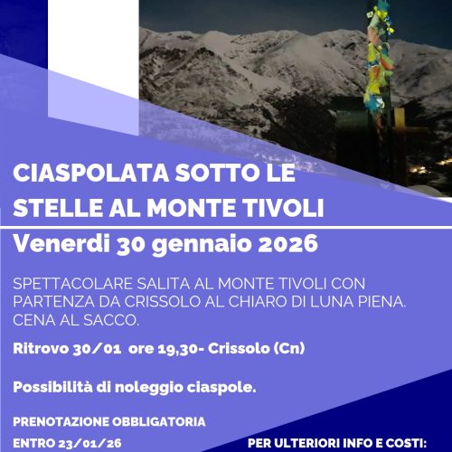 Il 30 gennaio le guide di Vesulus propongono una ciaspolata notturna, dalle 19.30 alle 23.30 circa, al Monte Tivoli con partenza da Crissolo per arrivare sotto il Monviso, tanto vicino da poterlo "quasi toccare". L'escursione è adatta a tutti, purchè abituati a fare attività fisica, ed è su prenotazione.
