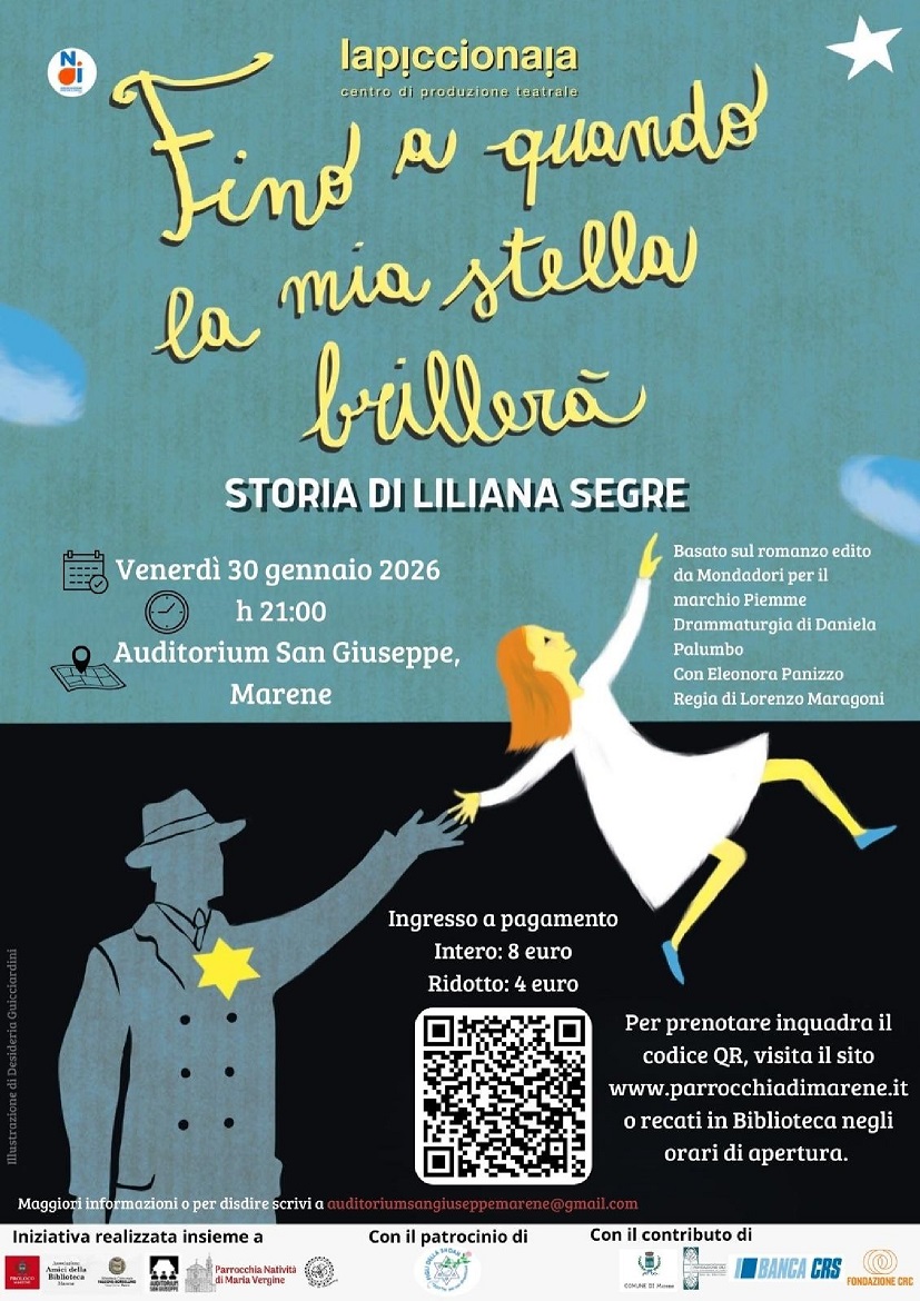 In occasione della Giornata della Memoria, venerdì 30 gennaio alle ore 21 presso l'Auditorium San Giuseppe di Marene, spettacolo teatrale FINO A QUANDO LA MIA STELLA BRILLERA' - Storia di Liliana Segre. Drammaturgia di Daniela Palumbo, con Eleonora Panizzo e regia di Lorenzo Marangoni. A cura della compagnia La Piccionaia. Ingresso intero 8€, ridotto 4€. Per prenotare clicca qui.